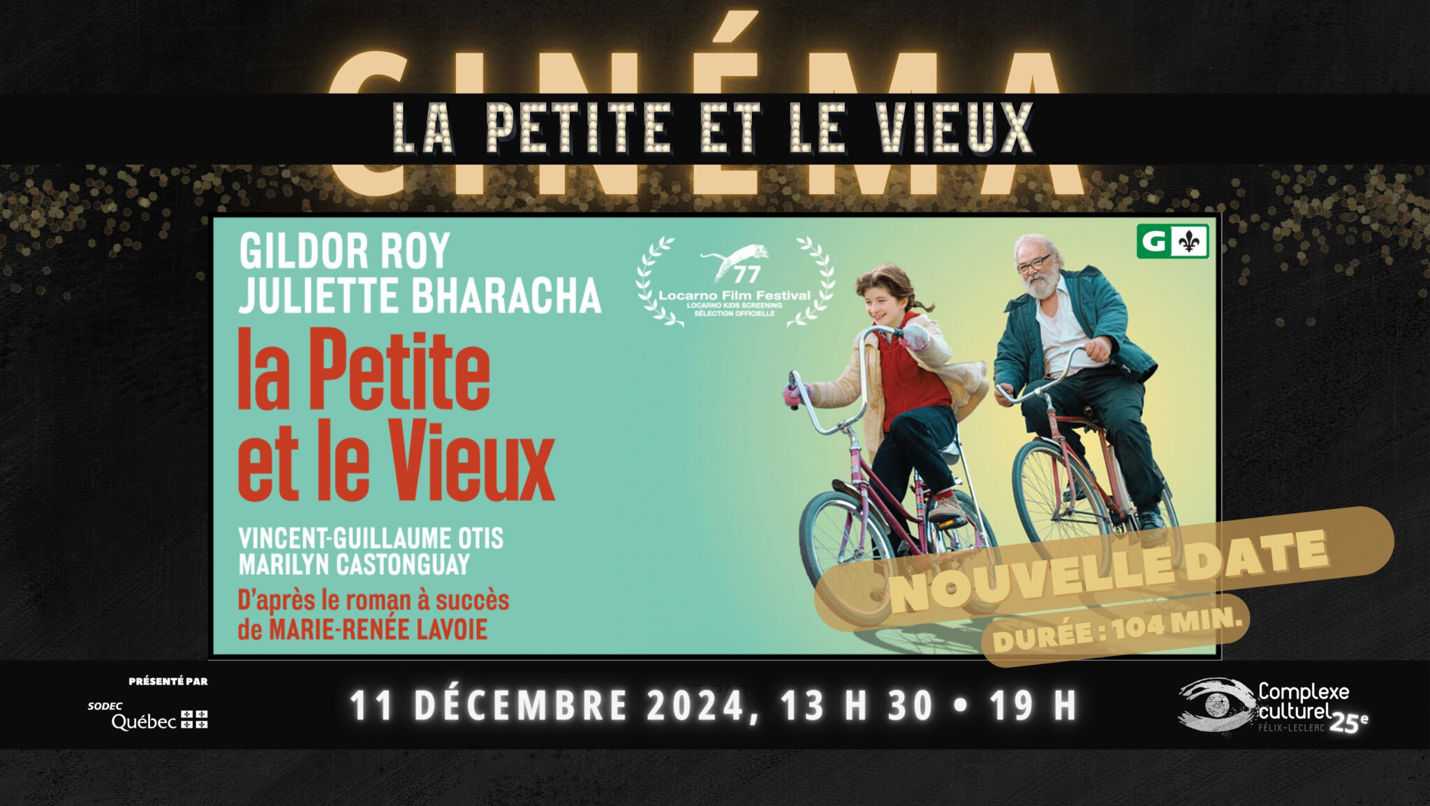 LA PETITE ET LE VIEUX Can. 2024. Comédie dramatique de Patrice Sauvé avec Juliette Bharucha, Gildor Roy, Vincent-Guillaume Otis. À Limoilou dans les années 1980, une fillette à l’imagination fertile se lie d’amitié avec son nouveau voisin, un vieil homme bourru. Durée: 104 min. Général. *Film également présenté le mercredi 11 décembre, à 19 h […]